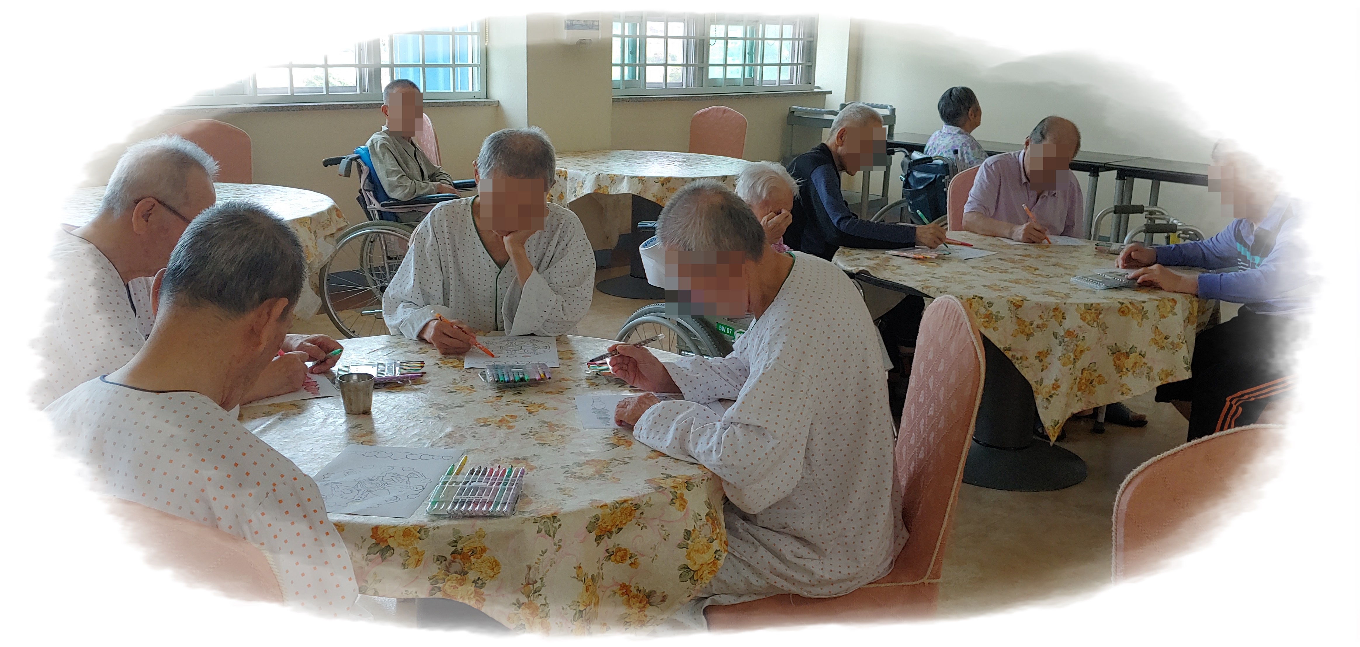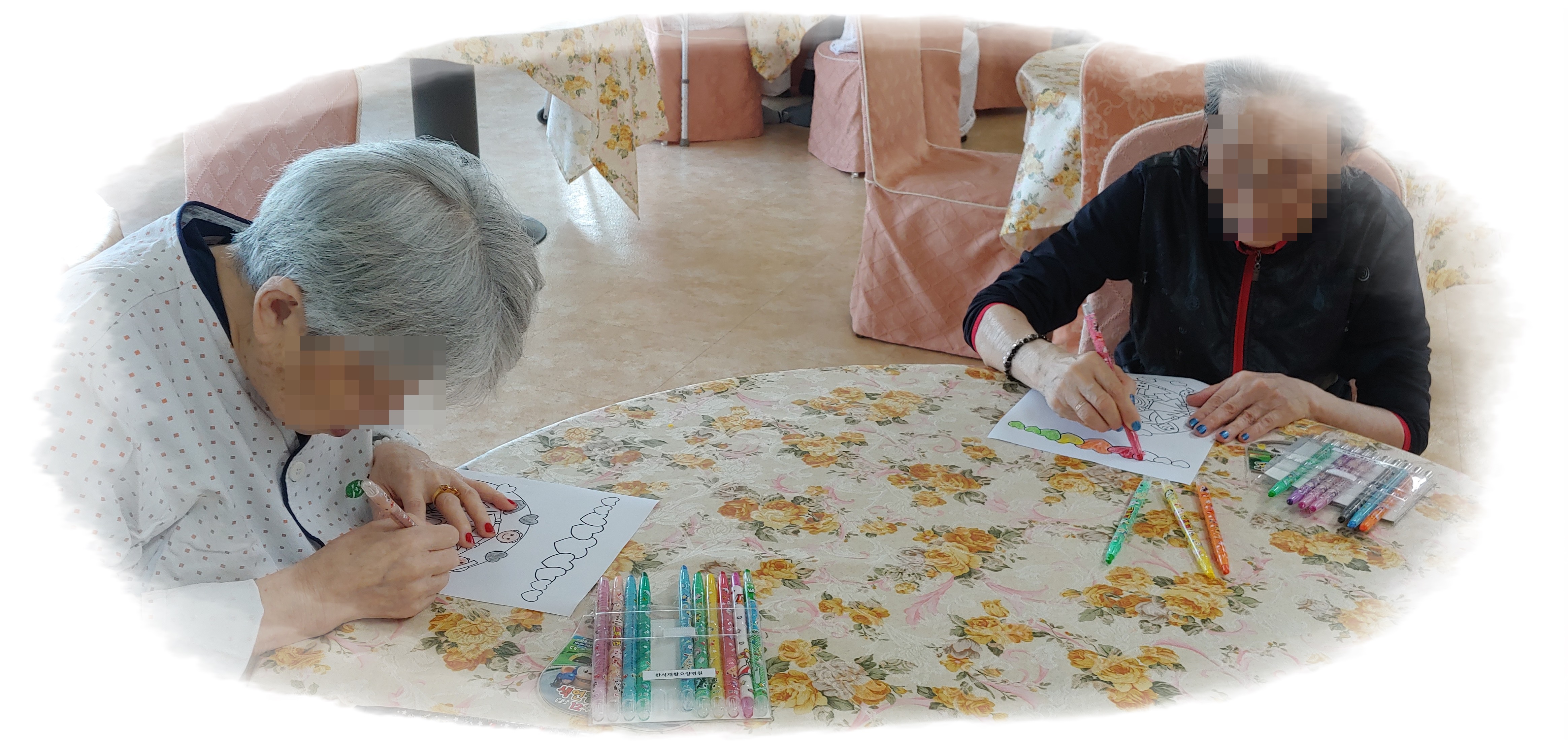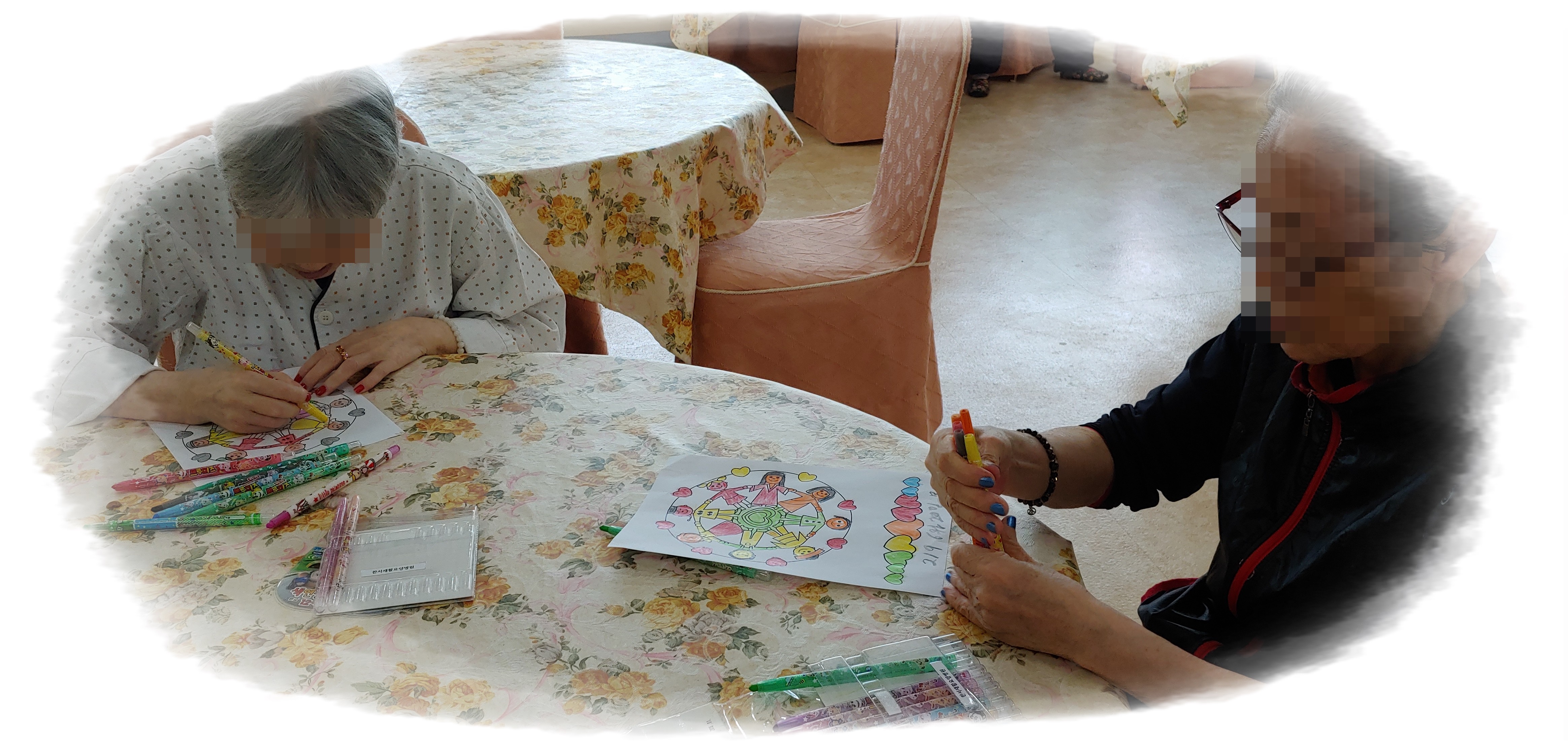 옆에 환우분이 색칠한 그림을 보고 잘했다고 칭찬도 하며