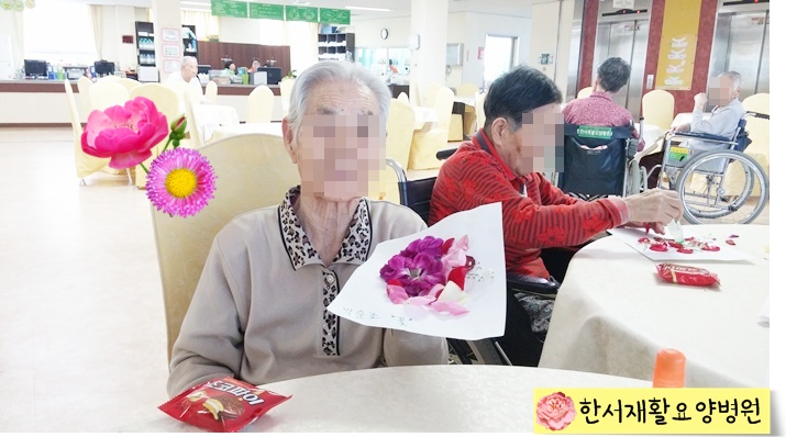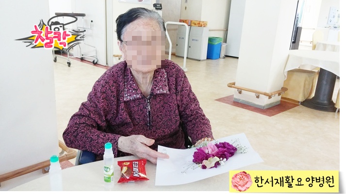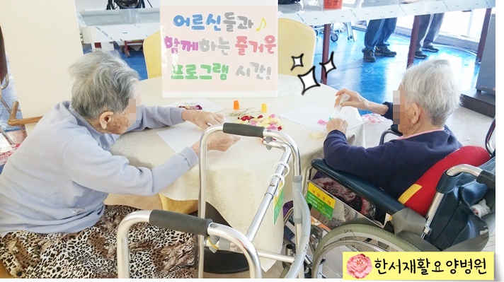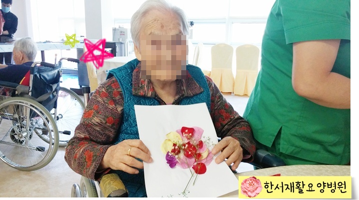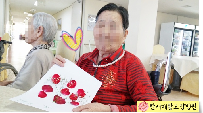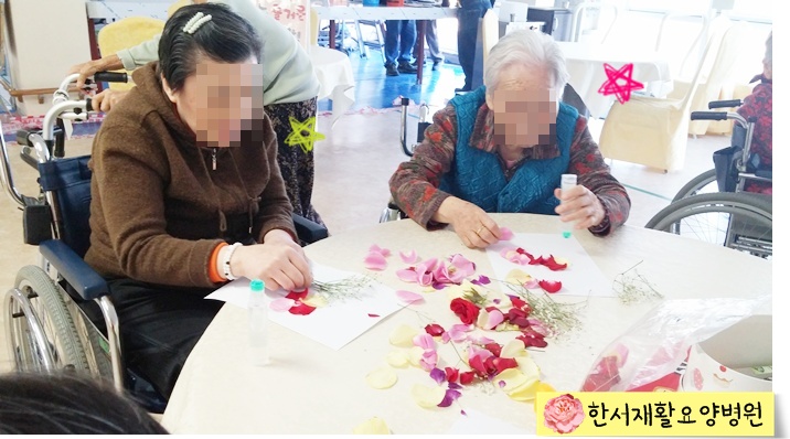 어르신들 모두 생화를 만지며 붙이는 활동에