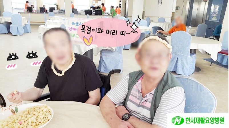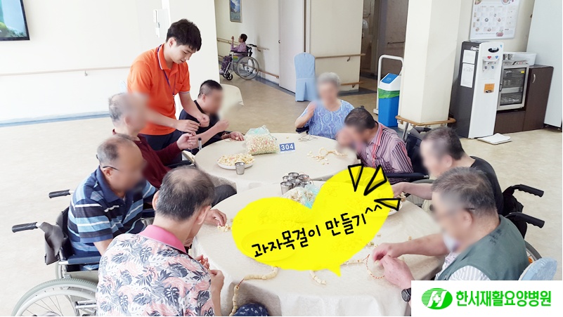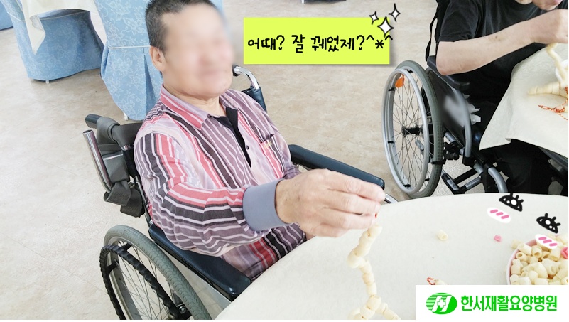 오전에 어르신들과 '과자 목걸이 시즌2'를 진행 하였습니다.